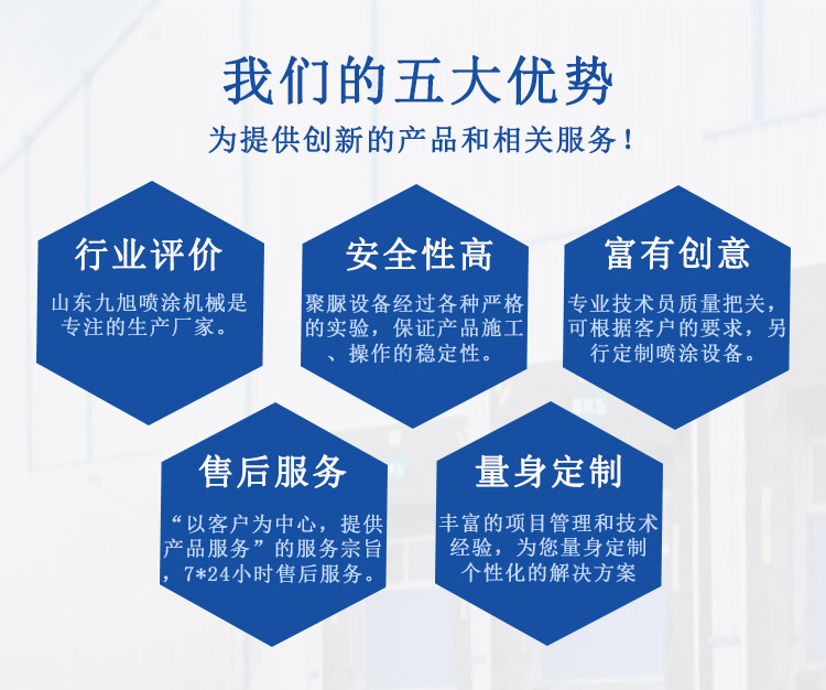 山東九旭機(jī)械科技有限公司是專業(yè)從事聚脲噴涂,聚脲噴涂設(shè)備,聚脲噴涂機(jī),聚脲原料,聚脲防水涂料,聚脲設(shè)備產(chǎn)品配件的、生產(chǎn)、銷售和服務(wù)為一體的公司。歷經(jīng)十余年的發(fā)展,已成長(zhǎng)為聚氨酯設(shè)備行業(yè)頗具實(shí)力的設(shè)備制造業(yè)之一...